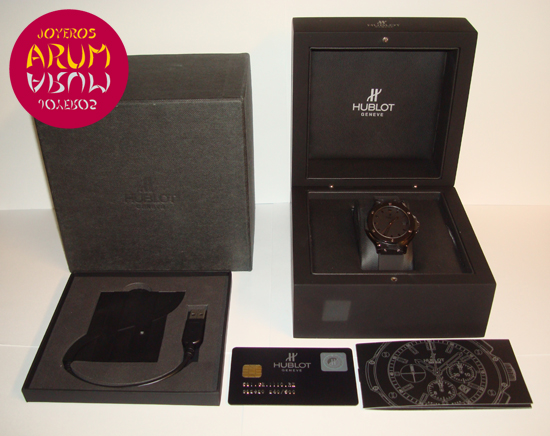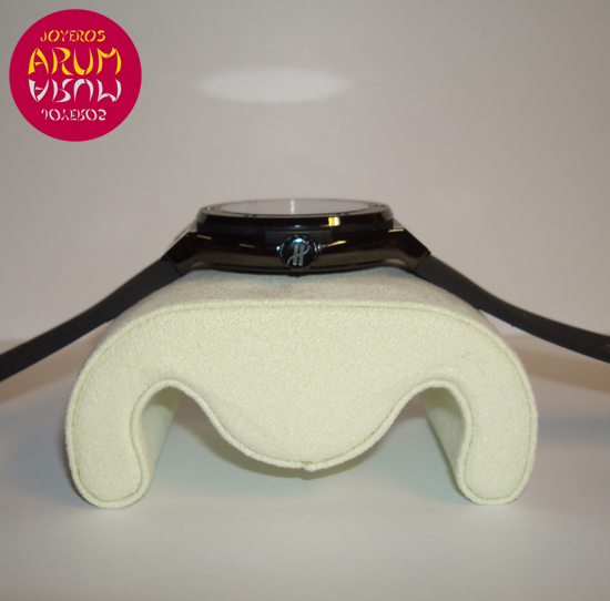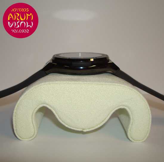 Description :limited edition of 500 pieces, black ceramic, black dial, screw fixed bezel, antireflective sapphire crystal, quartz movement, caliber HUB 2910, central seconds, date at three, crown at right, diameter 38 mm, rubber strap, folding clasp.