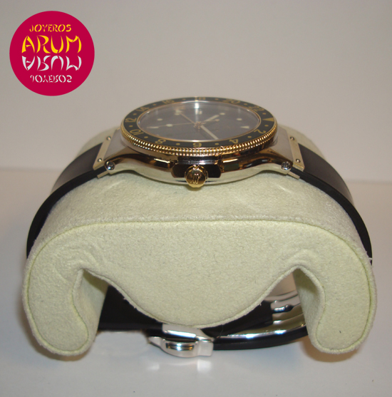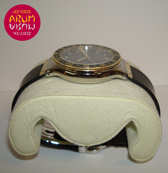 Description :steel and yellow gold, green bezel and dial, sapphire crystal, rotating bezel, quartz movement, central second, GMT function (second time zone indicated by auxiliary handle), date at three, screw crown, diameter 35 mm, waterproof 100 meters , rubber strap, steel folding clasp.