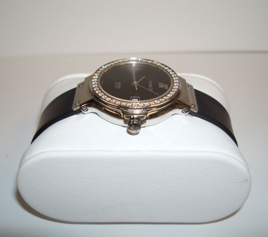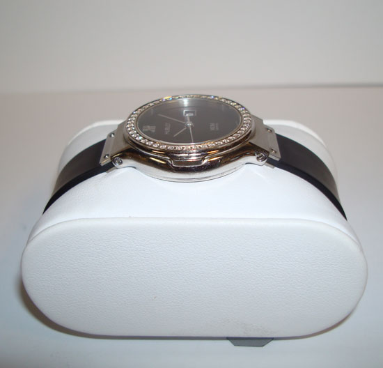 Description :steel, black sphere, sapphire crystal, bezel with diamonds, quartz movement, center seconds, date at three, 28,5 mm diameter, 50 meters waterproof, rubber strap, folding clasp.