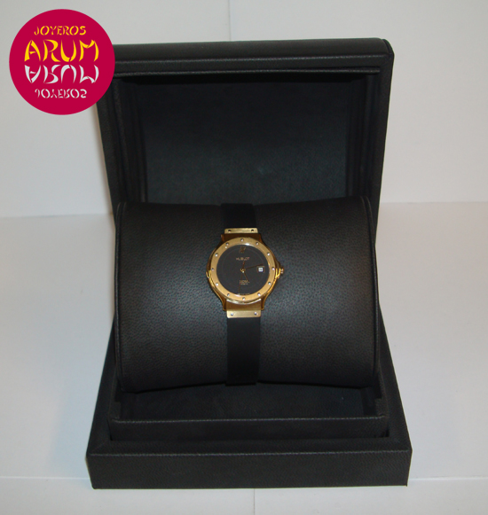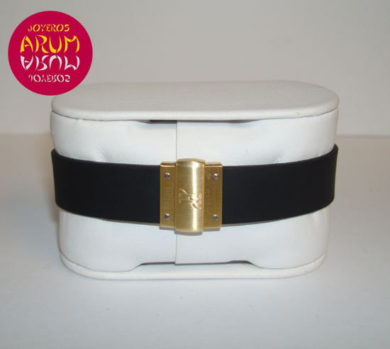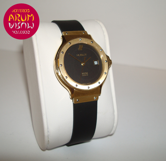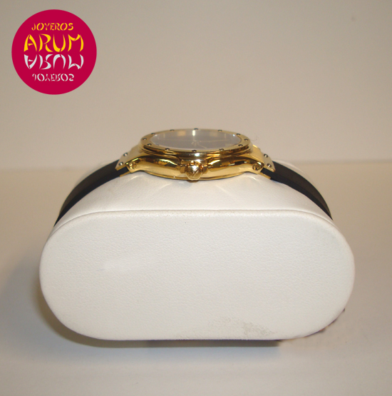 Description :lady’s watch, yellow gold, black dial, screwed bezel, sapphire crystal, quartz movement, central second, date at three, diameter 28 mm, rubber strap, gold folding clasp.