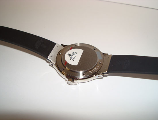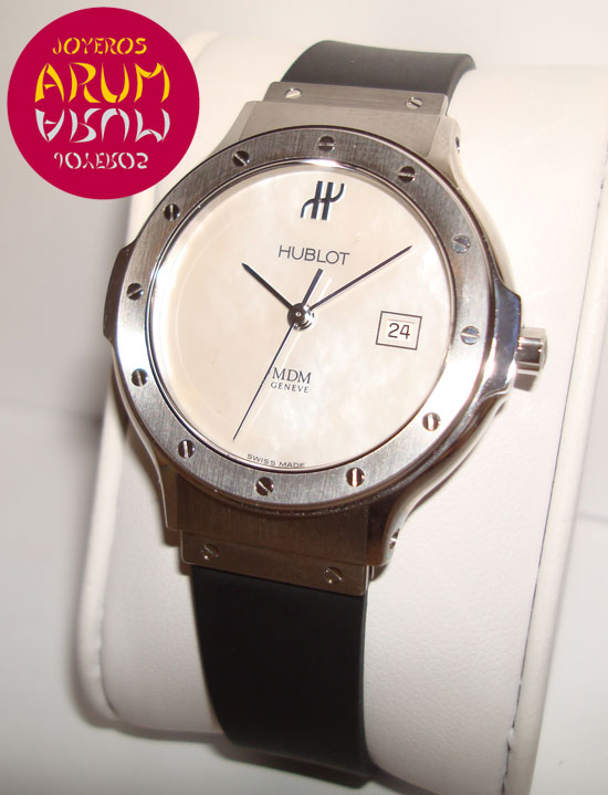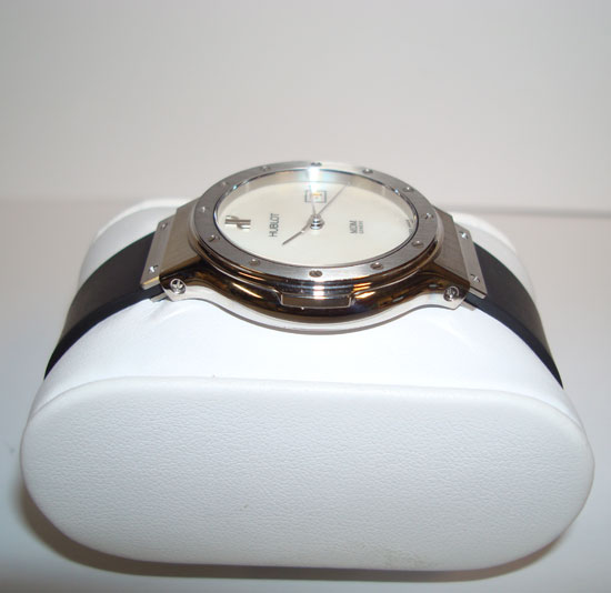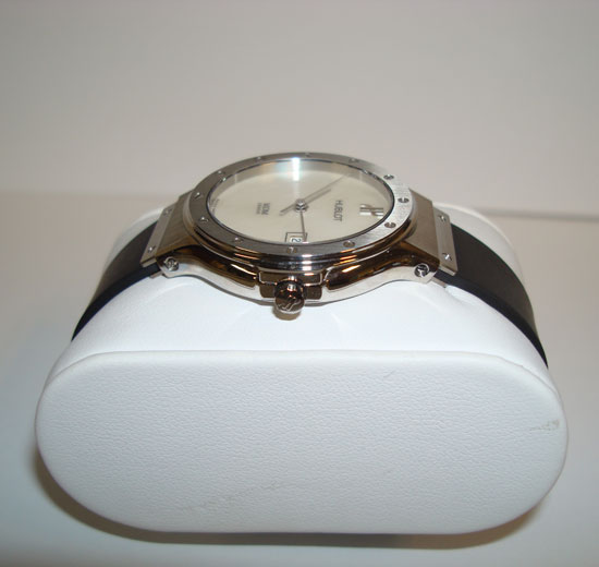 Description :steel, sphere pearl, screw bezel, sapphire crystal, quartz movement, center seconds, luminescent handles indicators, date at three o’clock, screw crown, diameter 32 mm, 30 meters waterproof, rubber strap, folding clasp.