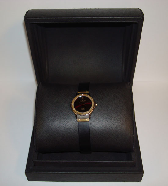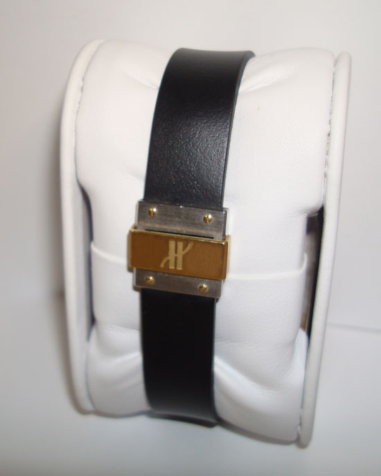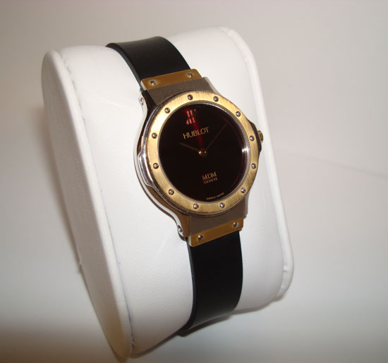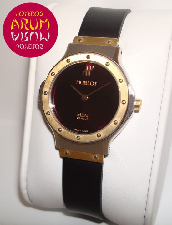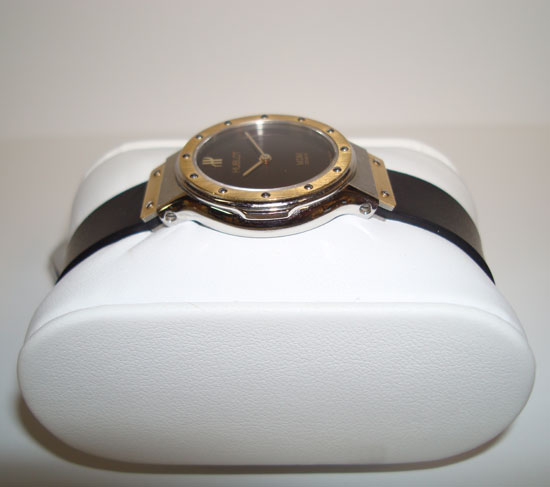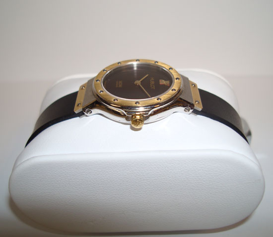 Description :lady’s watch, steel and gold, screw bezel, black dial, quartz movement, sapphire crystal, diameter 25 mm, 50 meters water resistant, removable screw crown, black rubber strap, folding clasp.
