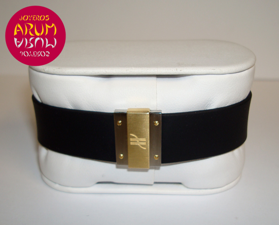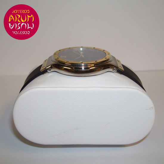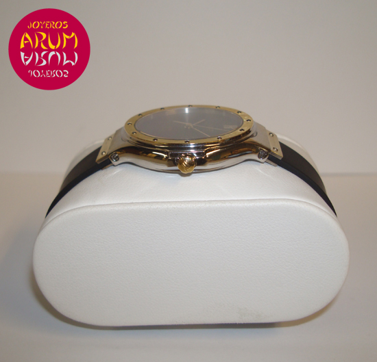 Description :lady’s watch, steel and yellow gold, black dial, screwed bezel, sapphire crystal, quartz movement, central second, date at three, screw crown, diameter 32 mm, water resistant 50 meters, rubber strap, folding clasp.