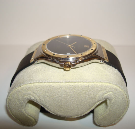 Description :steel and yellow gold, screw bezel, black dial, sapphire crystal, quartz movement, central second, date at three o’clock, screw crown, diameter 36 mm, rubber strap, steel and yellow gold clasp.