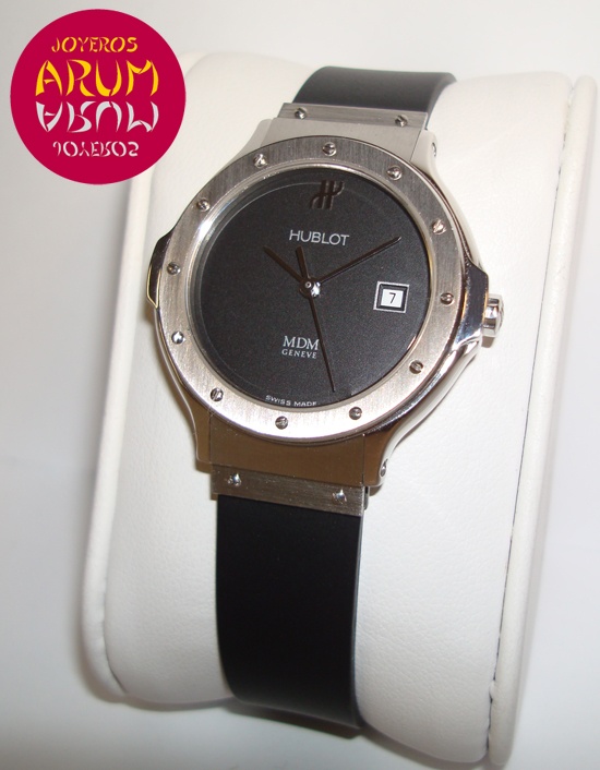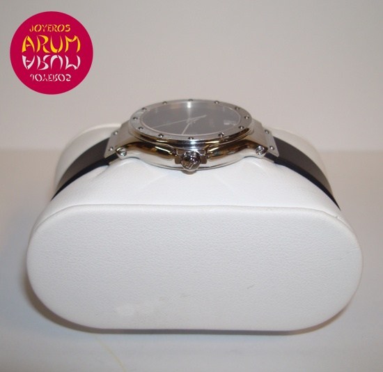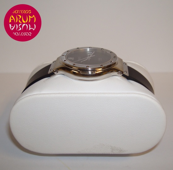 Description :lady’s watch, steel, black dial, screwed bezel, sapphire crystal, quartz movement, central second, date at three, screw crown, diameter 28 mm, water resistant 50 meters, rubber strap, folding clasp.