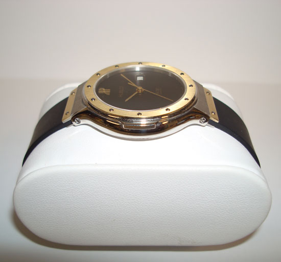 Description :lady’s watch, steel and yellow gold, screwed bezel, black dial, sapphire crystal, quartz movement, sweep second, date at three, diameter 32 mm, rubber strap, folding clasp.