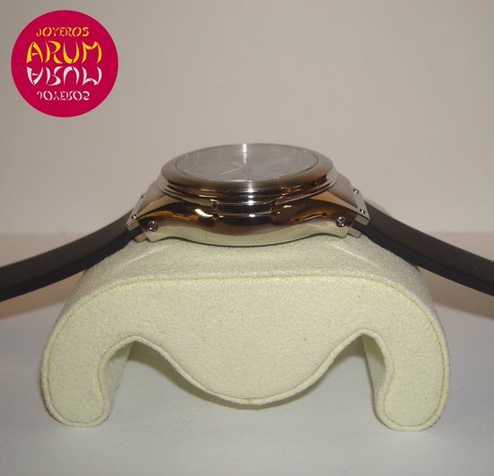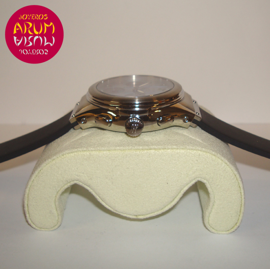 Description :steel, blue mother of pearl dial, sapphire crystal, fixed bezel, automatic movement, chronograph, three indicators on the dial, seconds, minutes, hours, date between four and five, luminiscent handles, screw crown and two buttons, 40 mm diameter, 100 meters waterproof, rubber strap, steel folding clasp.