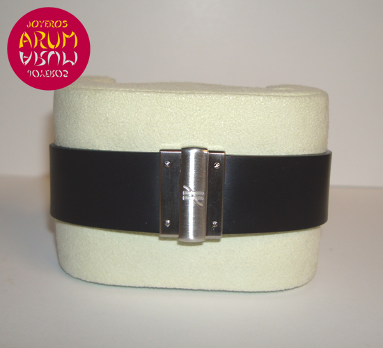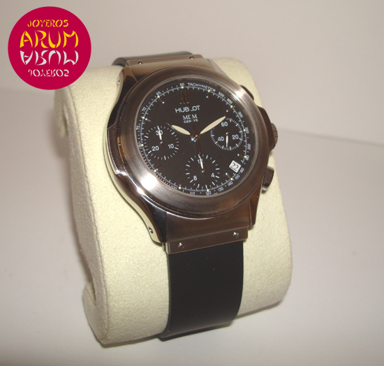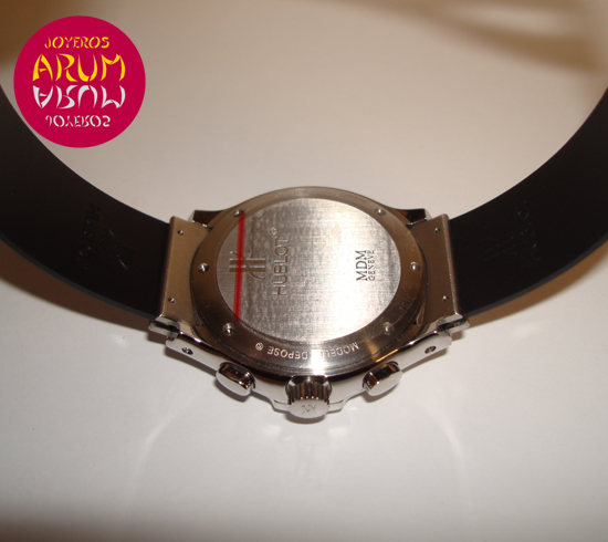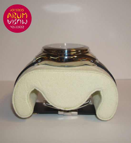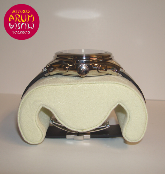 Description :steel, black dial, smooth bezel, sapphire crystal, automatic movement, chronograph, three indicators on the dial, seconds, minutes and hours, luminescent handles, date between 4 and 5, waterproof 100 meters, diameter 40 mm, crown and push buttons at right, rubber strap, folding clasp in steel, year 2001.