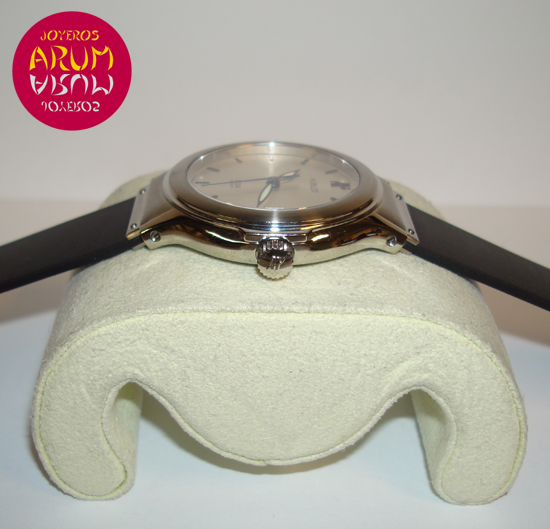 Description :steel, silver dial without numbers, smooth bezel, sapphire crystal, automatic movement, center seconds, blue steel hands, luminiscent handles, date at three, screw crown, diameter 37 mm, 50 meters water resistant, black rubber strap, folding clasp steel.
