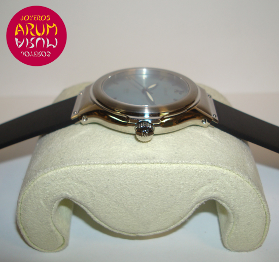Description :steel, mother of pearl dial, smooth bezel, sapphire crystal, automatic movement, center seconds, blue steel hands, luminiscent handles, date at three, screw crown, diameter 37 mm, 50 meters water resistant, black rubber strap, folding clasp steel.