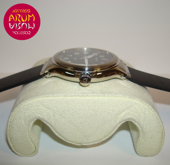 Description :steel, black dial with arabic numerals, smooth bezel, sapphire crystal, automatic movement, center seconds, handles and luminescent dial, date at three, screwed crown, diameter 37 mm, 50 meters water resistant, black rubber strap, folding clasp steel.