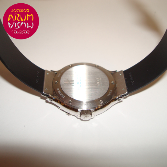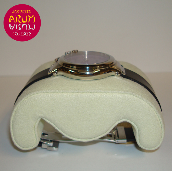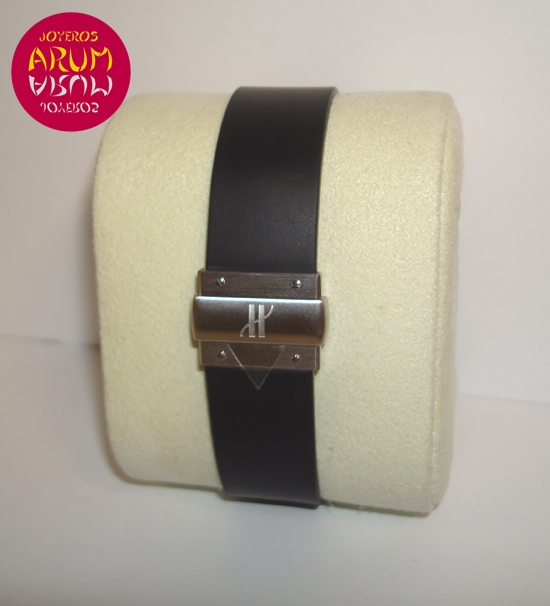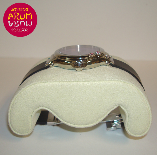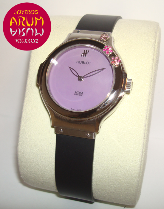 Description :lady’s watch, steel, violet dial, amethyst in bezel decorated with floral motifs, quartz movement, 32.5 mm diameter, 50 meters waterproof, rubber strap, folding clasp.