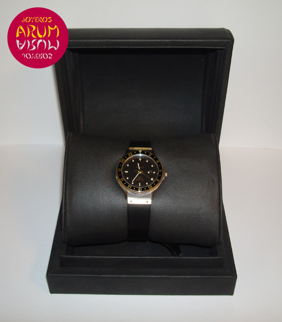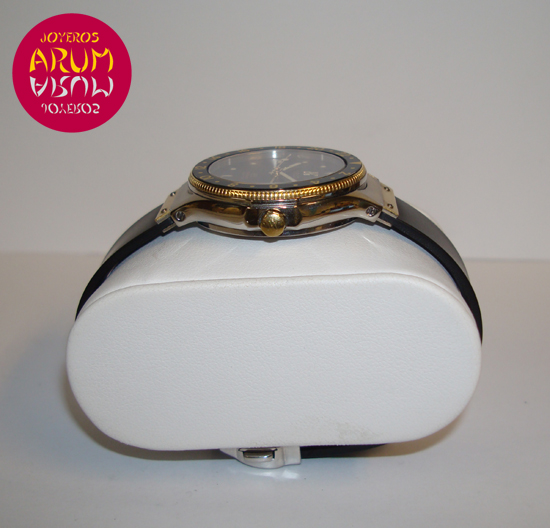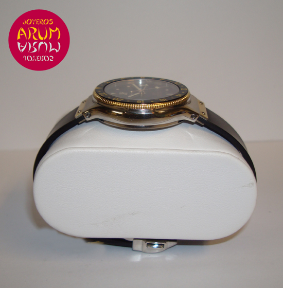 Description :lady’s watch, steel and yellow gold, black dial, rotating bezel, sapphire crystal, quartz movement, central second, date at three, screw crown, diameter 31,5 mm, water resistant 100 meters, rubber strap, folding clasp.