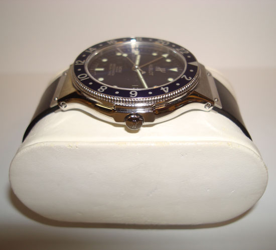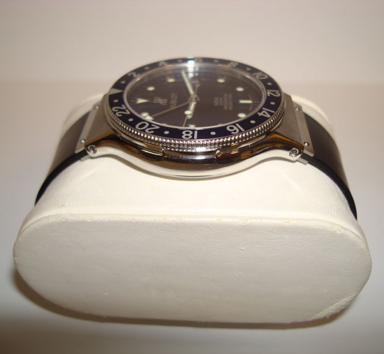 Description :steel, blue dial, rotating bezel, sapphire crystal, quartz movement, GMT function (second time zone), date at three, diameter 35 mm, 100 meters waterproof, rubber strap, steel folding clasp.