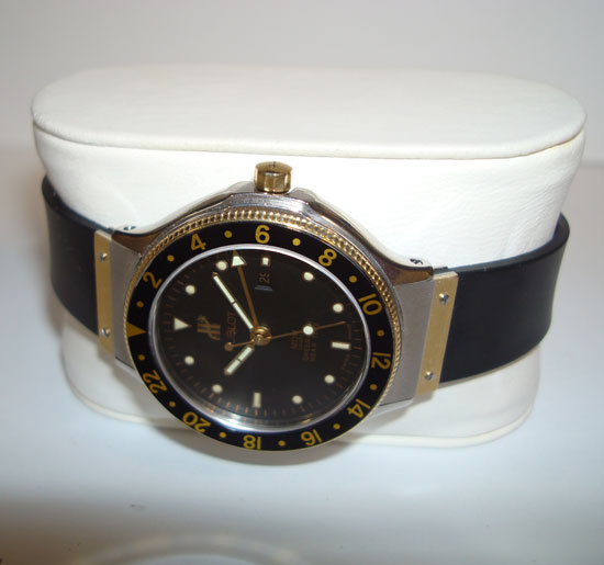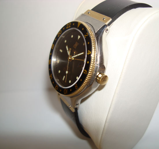 Description :steel and yellow gold, black dial, bidirectional rotating bezel, quartz movement, sapphire crystal, center seconds, luminescent handles and dial, date at three o’clock, GMT, diameter 31 mm, resistant 100 meters, removable screw crown, rubber strap, folding clasp.