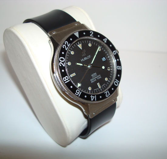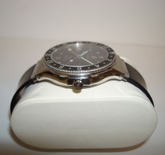 Description :steel, black dial, bidirectional rotating bezel, quartz movement, sapphire crystal, center seconds, luminescent handles and dial, date at three o’clock, GMT, diameter 35 mm, resistant 100 meters, removable screw crown, rubber strap, folding clasp.