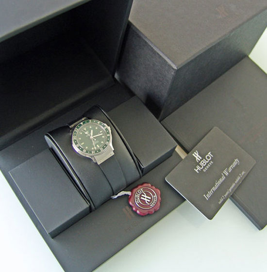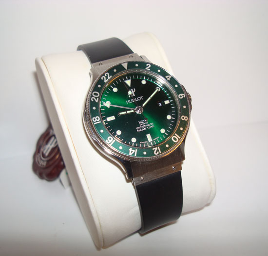 Description :stainless steel, quartz movement, sapphire crystal plane, adjustable closure with anagram Hublot, green area with reflections (incident light), luminescence, time frame, diameter 32 mm, weight 49.4 grams, rotating bezel with metal numbers.