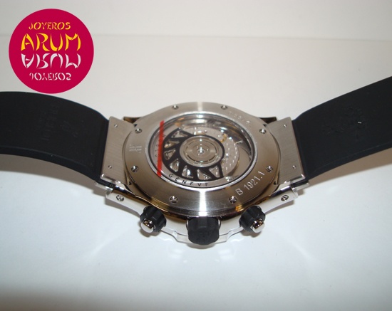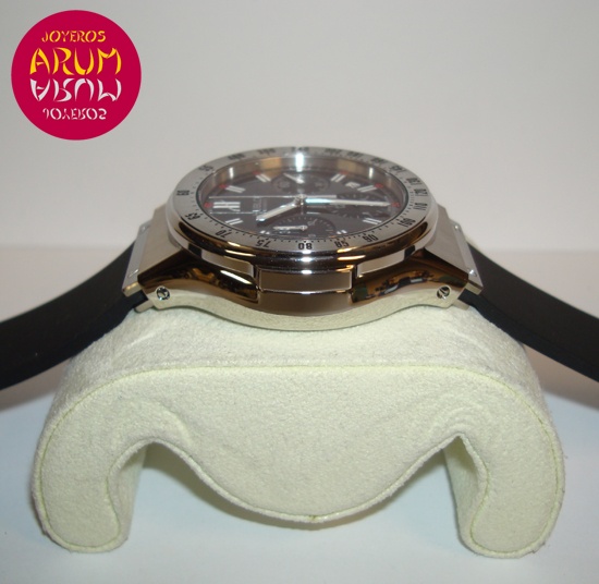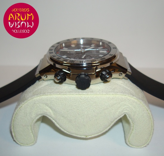 Description :steel, black dial, sapphire crystal, fixed bezel with numeric scale, automatic movement, chronograph, three indicators on the dial, seconds, minutes, hours, date between four and five, handles and luminescent dial, screw crown and buttons with protective rubber, 42 mm diameter, 100 meters waterproof, rubber strap, steel folding clasp.
