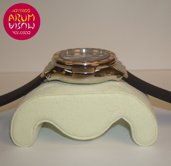 Description :pink gold, black dial, bezel with numeric scale, sapphire crystal, automatic movement, chronograph, three indicators on the dial, seconds, minutes and hours, handles and luminescent dial, date between 4 and 5, waterproof 100 meters, diameter 42 mm, crown and push buttons with protective rubber, rubber strap, folding clasp in steel.