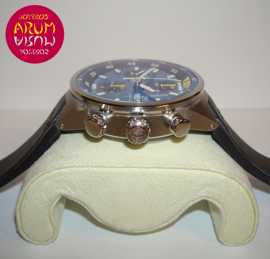 Description :limited edition of 2500 pieces, steel, blue dial, sapphire crystal, automatic movement, chronograph, three indicators on the dial, seconds, minutes, hours, day of week and date at three, handles and luminescent dial, screw crown, button for the chrono and crown to control the inner bezel, waterproof 100 meters, diameter 43 mm, back cover with engraved Calypso, the ship of Jacques-Ives Cousteau, rubber strap, steel buckle closure.