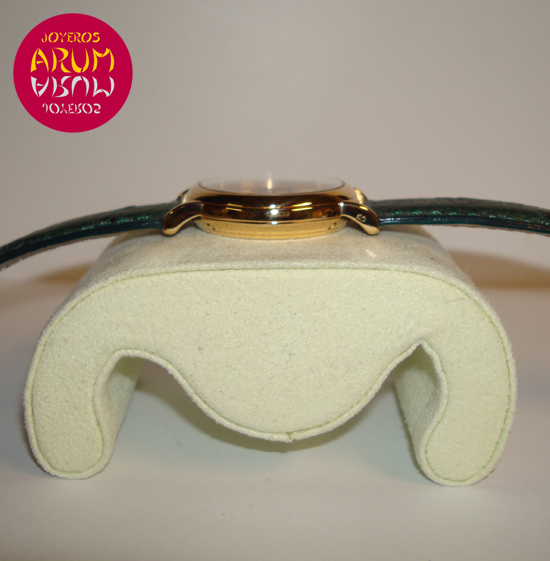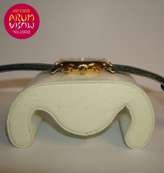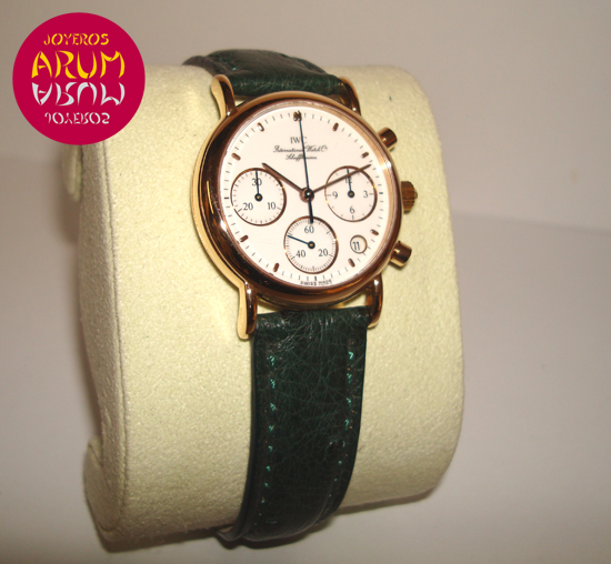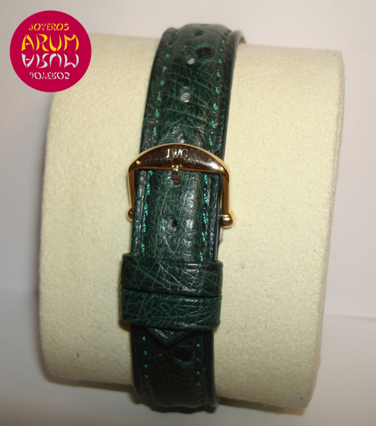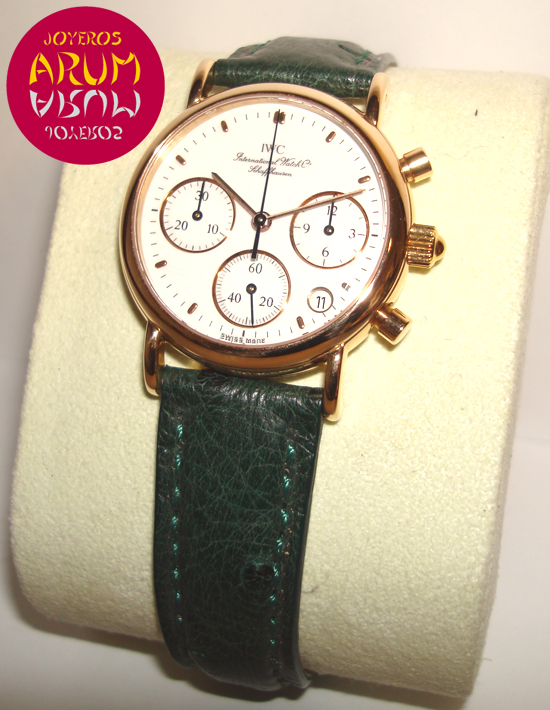 Description :lady’s watch, yellow gold, white dial, sapphire crystal, quartz movement, chronograph, three indicators on the dial, seconds, minutes, hours, date between four and five, screw crown and two buttons at right, diameter 28 mm, green leather strap, original IWC buckle.