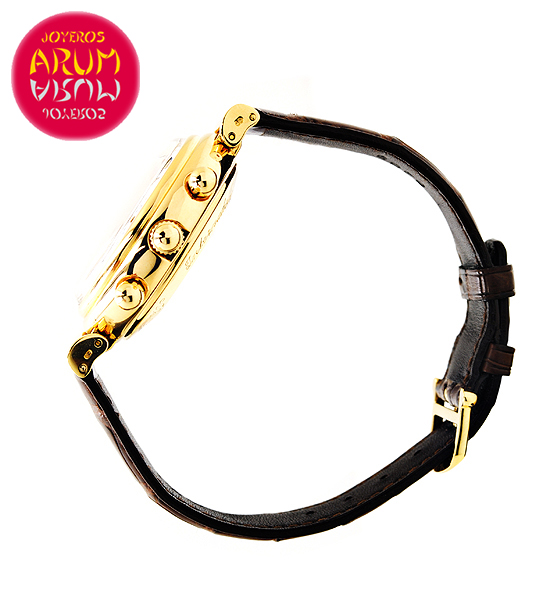 Other specifications :perpetual calendar, date at three, day at nine, month at six, year between seven and eight, moon phase at twelve, chronograph, small seconds at nine, luminiscence handles, blue steel hands, IWC 18 K gold buckle.