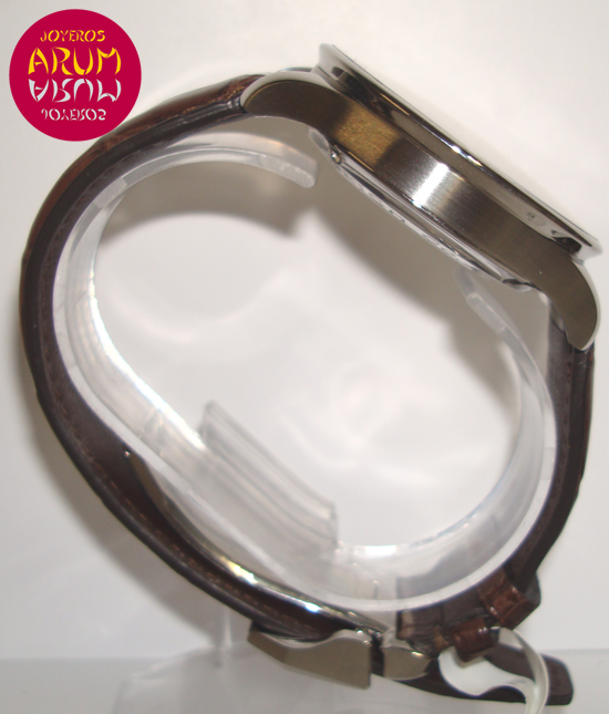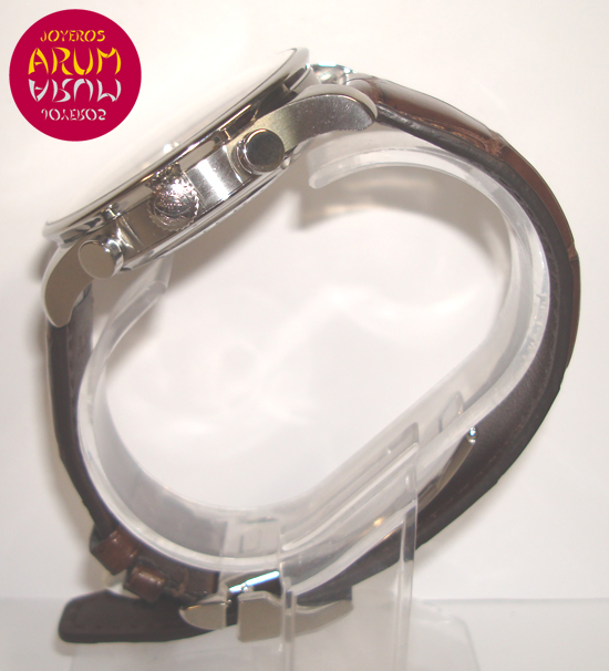 Description :steel, white dial with arabic numbers, sapphire crystal, automatic movement, power reserve 44 hours, chronograph, two indicators on the dial, minute indicator at twelve, small seconds at six, crown and two buttons at right, diameter 41 mm, waterproof 30 meters, brown leather strap, folding clasp, year 2010.