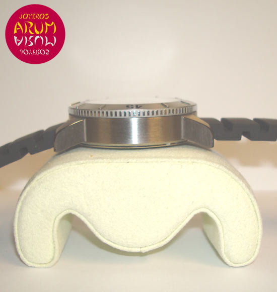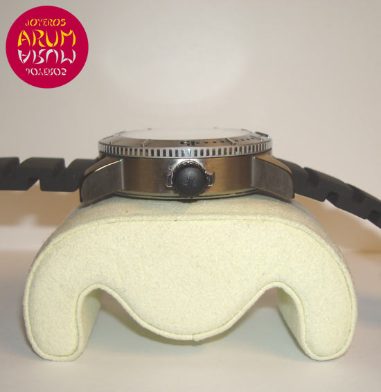 Description :limited edition of 1500 pieces, titanium, black dial, rotating bezel, sapphire crystal, automatic movement, luminescent indicators bezel, handles and dial, date at three, GMT function at nine (second time zone), small seconds at six, water resistant 1000 meters, locking crown to ensure waterproof, diameter 44 mm, rubber strap, available a second textile strap, buckle closure, year 2009.