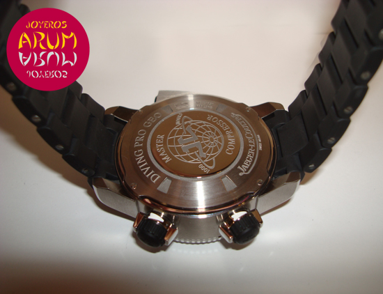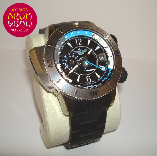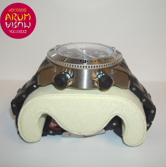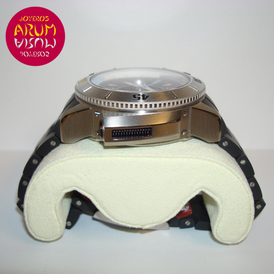 Description :titanium, black dial, sapphire crystal antireflective, unidirectional rotating bezel, automatic movement, power reserve of 48 hours, date at three, GMT function, second time zone by city at six, disc at nine to 24 am/pm hours function, depth immersion indicator in the inner bezel, water resistant 300 meters, two crown to the right and left button, luminescence dial and handles, diameter 46.3 mm, articulated rubber strap, titanium folding clasp. Includes a second strap.
