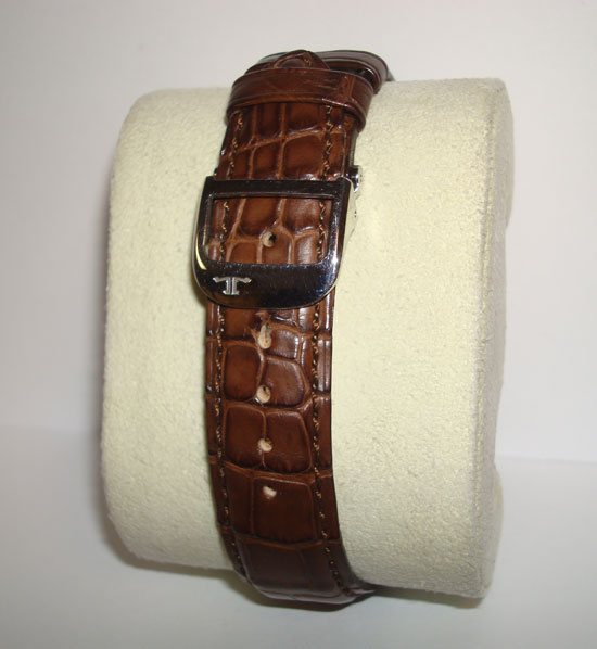 Description :steel case, reverse, quartz movement, sapphire crystal, diameter 26 mm by 42 mm, screw crown, brown leather strap, steel folding clasp.