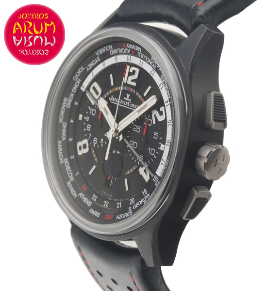 Other specifications :limited edition 500 pieces, colaboration between Jaeger LeCoultre and Aston Martin, chronograph, world time, date and small seconds at six, minute counter at three, hour counter at nine, luminiscence marks, auxiliary crown at ten.
