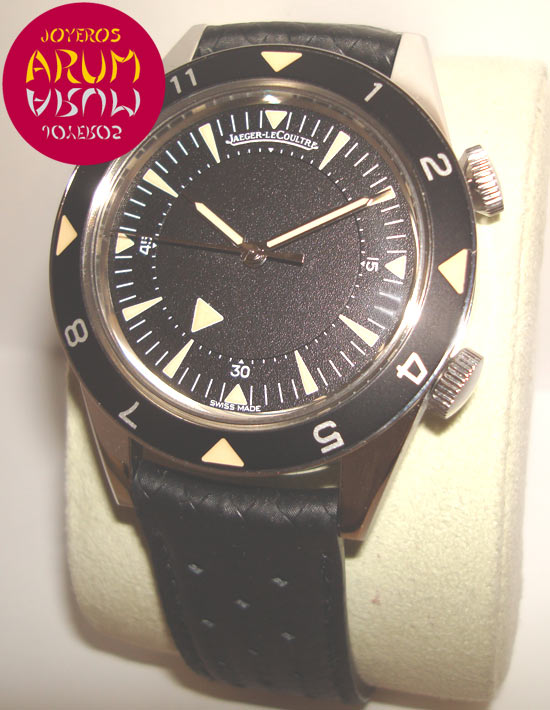 Description :reedition Jaeger LeCoultre Memovox Deep Sea 1959, limited to 959 pieces (Europe version), steel, black dial, fixed bezel, plexiglass crystal, automatic winding mechanical movement, Jaeger Le-Coultre caliber 956, produced, assembled and decorated by hand, 28,800 vibrations per hour, 23 jewels, 45 hours power reserve, central seconds, alarm function indicated by a luminescent triangle in the center, dial, handles and bezel with luminescent indicators, crown at two to alarm function, crown at four to handles, diameter 40.5 mm, water resistant to 10 bar (100 meters), back cover engraved with a diver, black leather strap, steel buckle closure, year 2012.