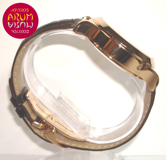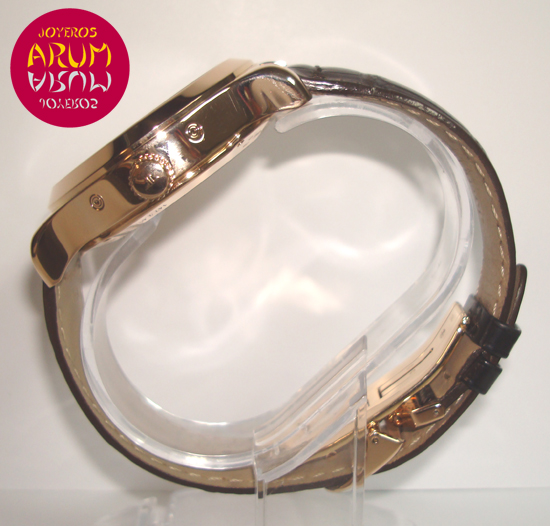 Description :rose gold, silver dial, smooth bezel, sapphire crystal, automatic movement, annual calendar, moon phase and small seconds at six, power reserve indicator at twelve, month at three, day of the week at nine, date with central handle, screw crown, transparent caseback, diameter 40.5 mm, waterproof 50 meters, brown leather strap, folding clasp, year 2008.