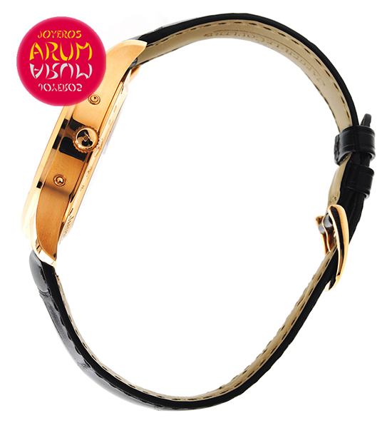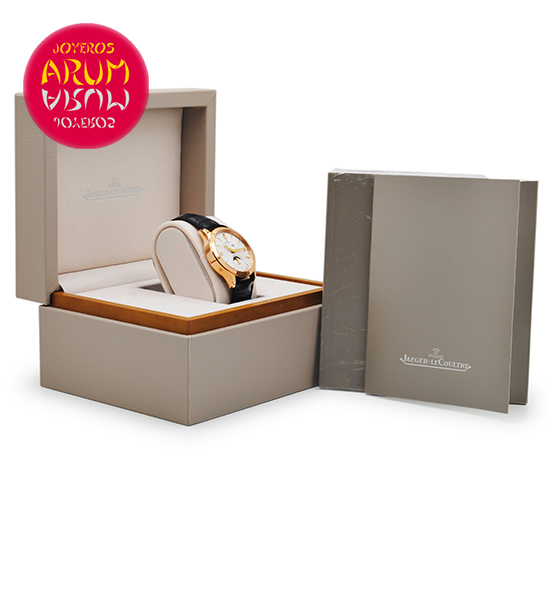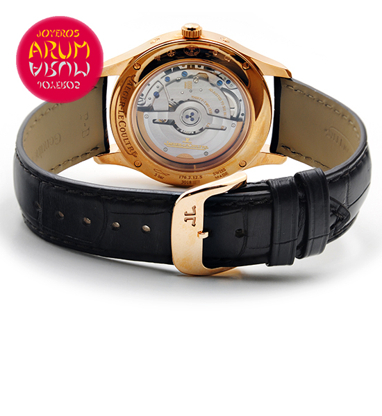 Other specifications :calibre 866, power reserve 43 hours, smooth bezel, day and month at twelve, date with central handle, moon phase and small seconds at six, transparent caseback, original JLC strap and buckle, 18K gold buckle.