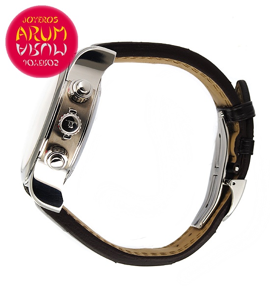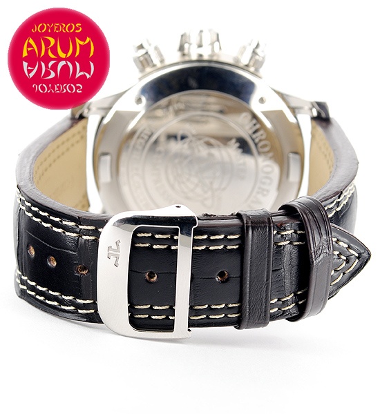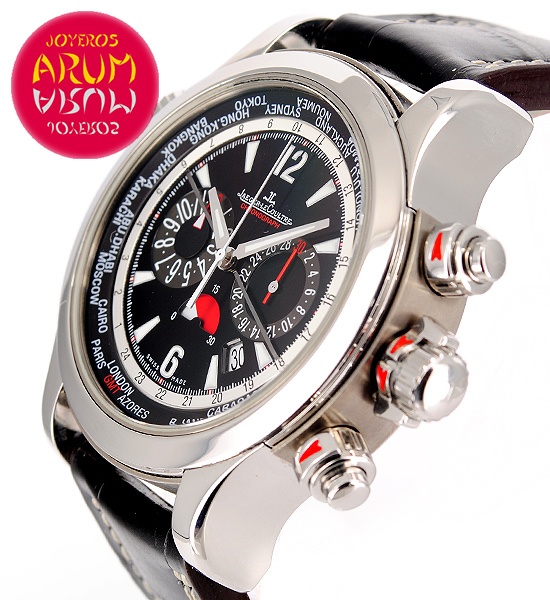 Other specifications :smooth bezel, chronograph, world time, date between four and five, small seconds at six, minute counter at three, hour counter at nine, luminiscence, screw crow and buttons, auxiliary crown at ten. Includes rubber strap JLC. Year 2008.