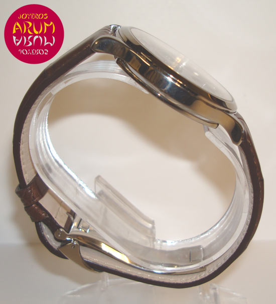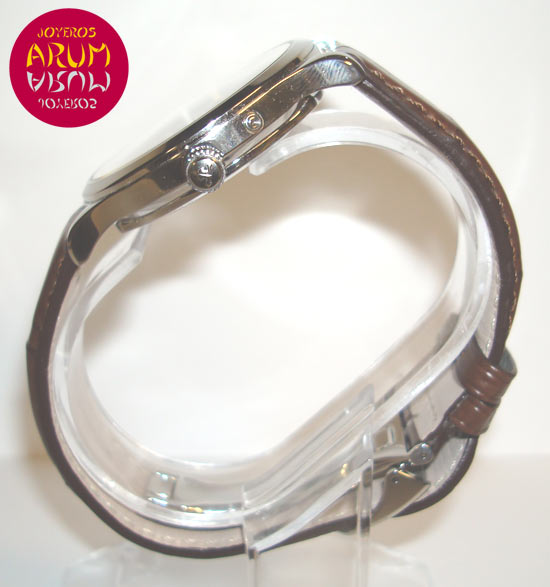 Description :steel, black dial, smooth bezel, sapphire crystal, automatic movement, small seconds at six, date between one and three, power reserve indicator between nine and twelve, screw crown, transparent back, diameter 37 mm, waterproof 30 meters, brown leather strap, steel folding clasp.