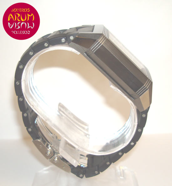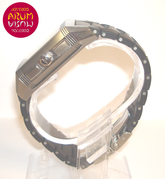 Description :limited to 1500 pieces, reverse back, titanium, black dial, sapphire crystal, automatic movement, caliber 753, chronograph, minutes indicator at three, hour indicator at nine, small seconds at six, day / night indicator, date at twelve, GMT function in the reverse zone, timezone of 24 cities, screw crown and two buttons, diameter 36 mm by 52.5 mm, waterproof 50 meters, articulated rubber strap, folding clasp, year 2008.