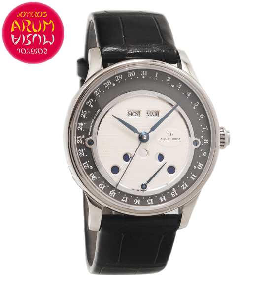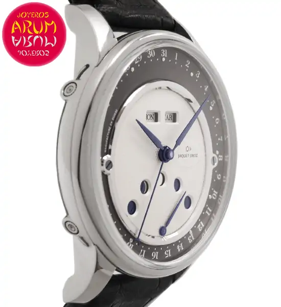 Other specifications :calibre 6553, power reserve 68 hours, retrograde moon-phase (it enables a display of the lunar cycle, interpreted as never before by a return to the point of departure once a lunar cycle is completed,every 29.5 days), complete calendar, day, date, month, blue steel hands, transparent caseback, 18K gold buckle.