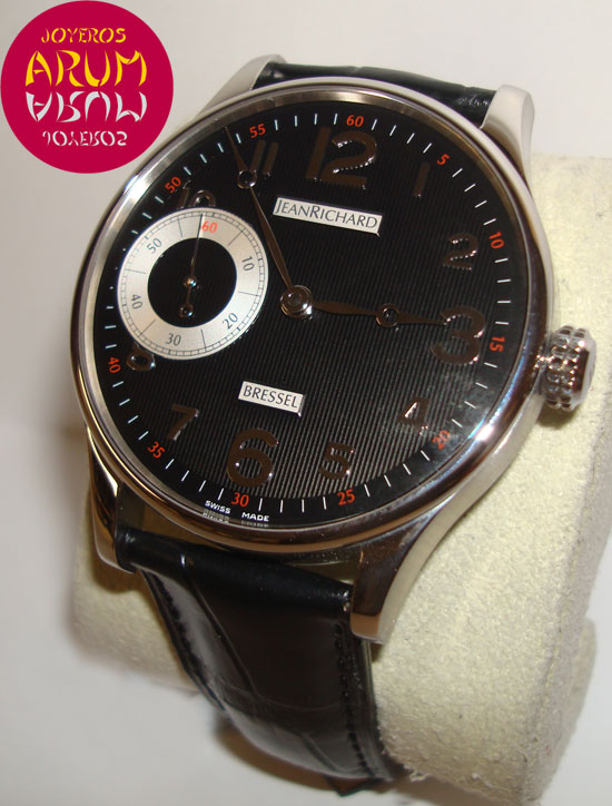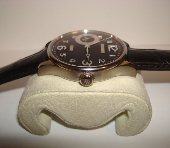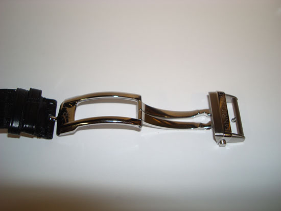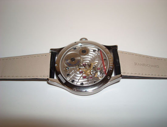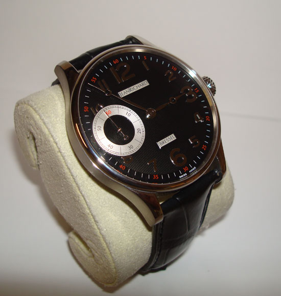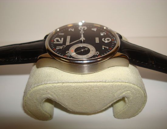 Description :steel, black fluted dial , sapphire crystal, manual movement, small seconds, screw crown, diameter 43 mm, waterproof 30 meters, transparent caseback, black leather strap, steel folding clasp.