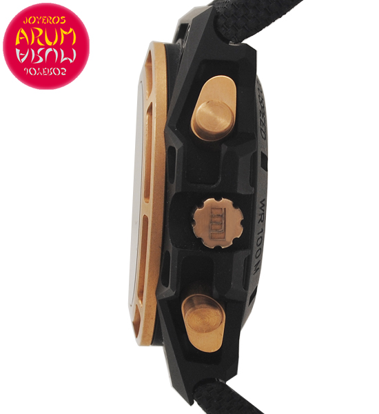 Other specifications :limited edition 100 pieces (027/100), black titanium and 18K rose gold, chronograph, small seconds at nine, luminous marks, transparent caseback, 18K gold buckle. Year 2014.
