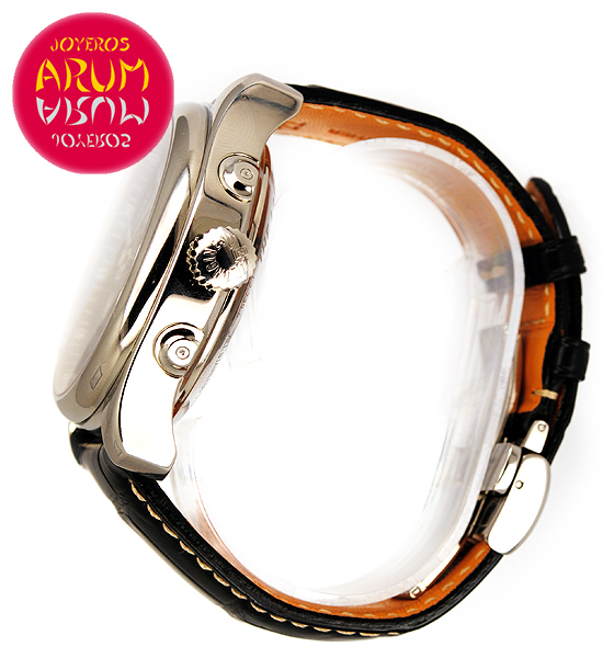 Other specifications :retrograde hands (jump system), GMT (second time zone at nine), date at three, day at twelve, moon phase, small seconds at six, luminiscence indicators, back transparent caseback. Year 2013.