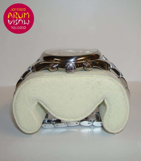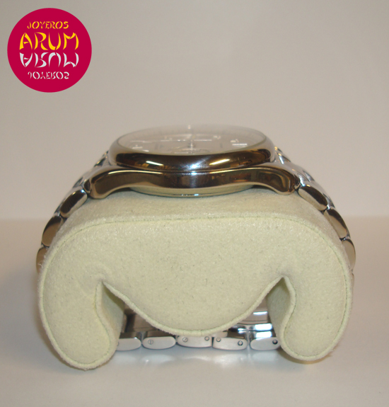 Description :steel, silver dial with arabic numbers, fixed bezel, sapphire crystal, automatic movement, caliber 651, luminescent handles, chronograph, two indicators on the dial, seconds and minutes, date at six, crown and two push buttons at right, water resistant 30 meters, diameter 39.5 mm, transparent caseback, steel strap, steel folding clasp, year 2000.