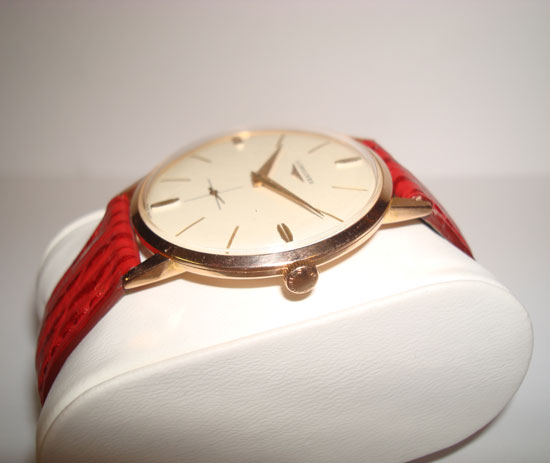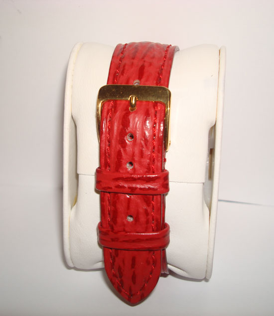 Description :pink gold, plastic glass, automatic movement, small seconds, diameter 34 mm, red leather strap, gold buckle closure.