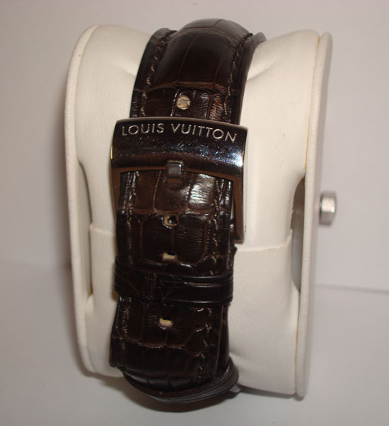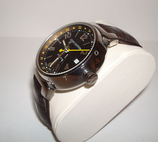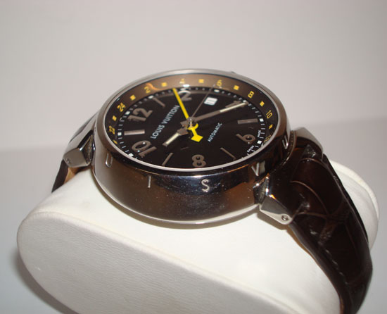 Description :steel, sapphire crystal, automatic movement, date, GMT, luminescent hands, waterproof 100 meters, diameter 40 mm, brown leather strap, steel buckle closure with anagram Louis Vuitton.