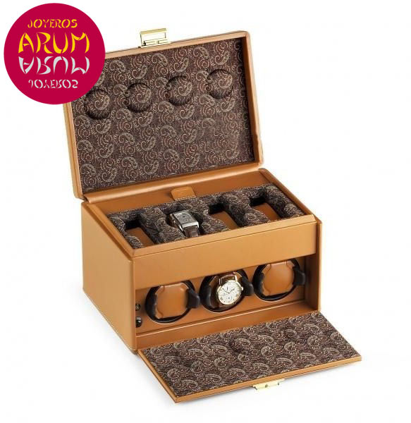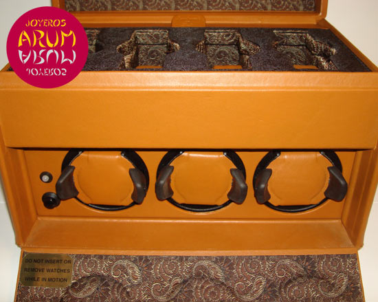 Description: With 3 rotors for big size watches plus storage space for 4 bracelet or strap watches and an extra compartment for straps. Fully leather covered outside. Leather and pure jacquard silk inside. Silver coloured clasp. Programmable, operates on batteries or with a 6 Volt DC adapter not included. 10 rotating programs.
