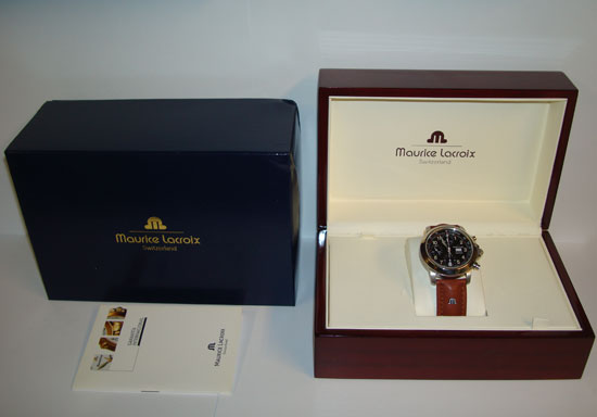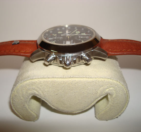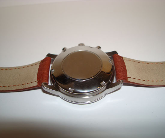 Description :steel, sapphire crystal, automatic movement, 3 indicators on the dial, seconds, minutes, hours, day of week, date at six o’clock, chronograph, handles and luminescent numbers, screw crown and two buttons, diameter 38 mm , leather strap..