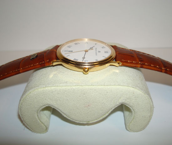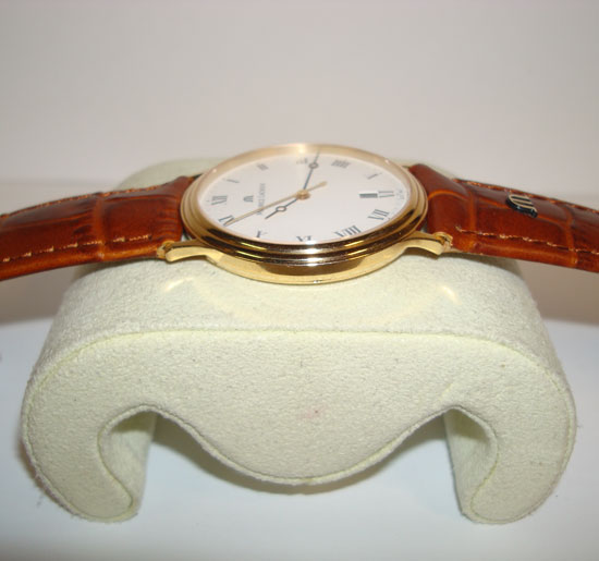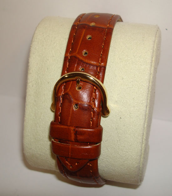 Description :yellow gold, white dial with roman numbers, sapphire crystal, quartz movement, central second, date at six o’clock, diameter 33.5 mm, brown leather strap, buckle closure.