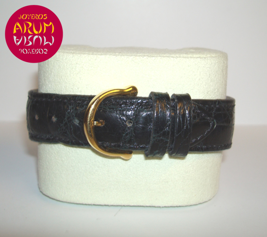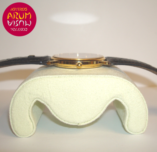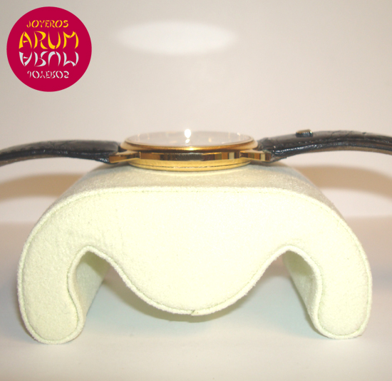 Description :yellow gold, white dial with Roman numbers, sapphire crystal, quartz movement, central second, date at six, screw crown, diameter 34 mm, black leather strap, buckle closure, year 2008.