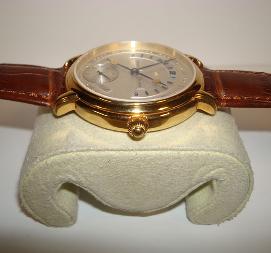 Description :yellow gold, sapphire crystal on both sides, manual movement, blued steel hands, 24 hour dial with two handles, one with symbol of sun that indicates the twelve hours of daylight, and other with the symbol of moon indicating the twelve hours of darkness, small seconds in nine, screw crown, back transparent cover, diameter 42 mm, 30 meters waterproof, leather strap brown, yellow gold buckle closure.