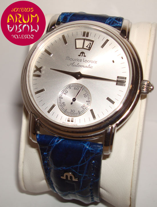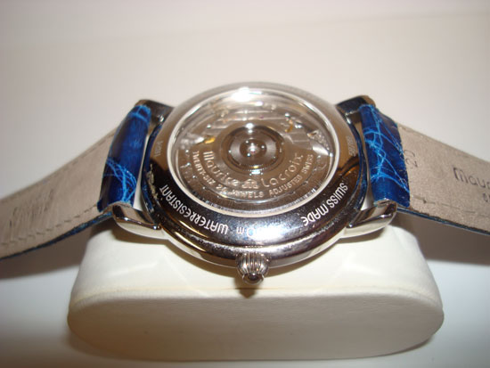 Description :steel, sapphire crystal, automatic movement, small seconds, date with double digit, 37 mm diameter, screw crown, transparent back cover, waterproof 50 meters, blue leather strap, steel buckle closure.